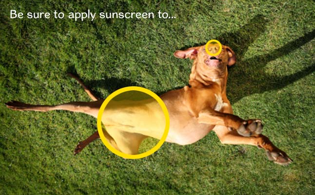 Dogs who worship the sun while lying on their backs risk developing tumors on the inguinal area, that vulnerable stretch of skin where the belly and hind legs meet; this area is unprotected by hair even on furry breeds. When you notice your sun-worshipping Spot panting, it’s time to bring him back indoors before he sustains a sunburn. Please take extra precaution if your dog’s snout is pink. Light-skinned dogs, like light-skinned people, are more prone to sun irritation.