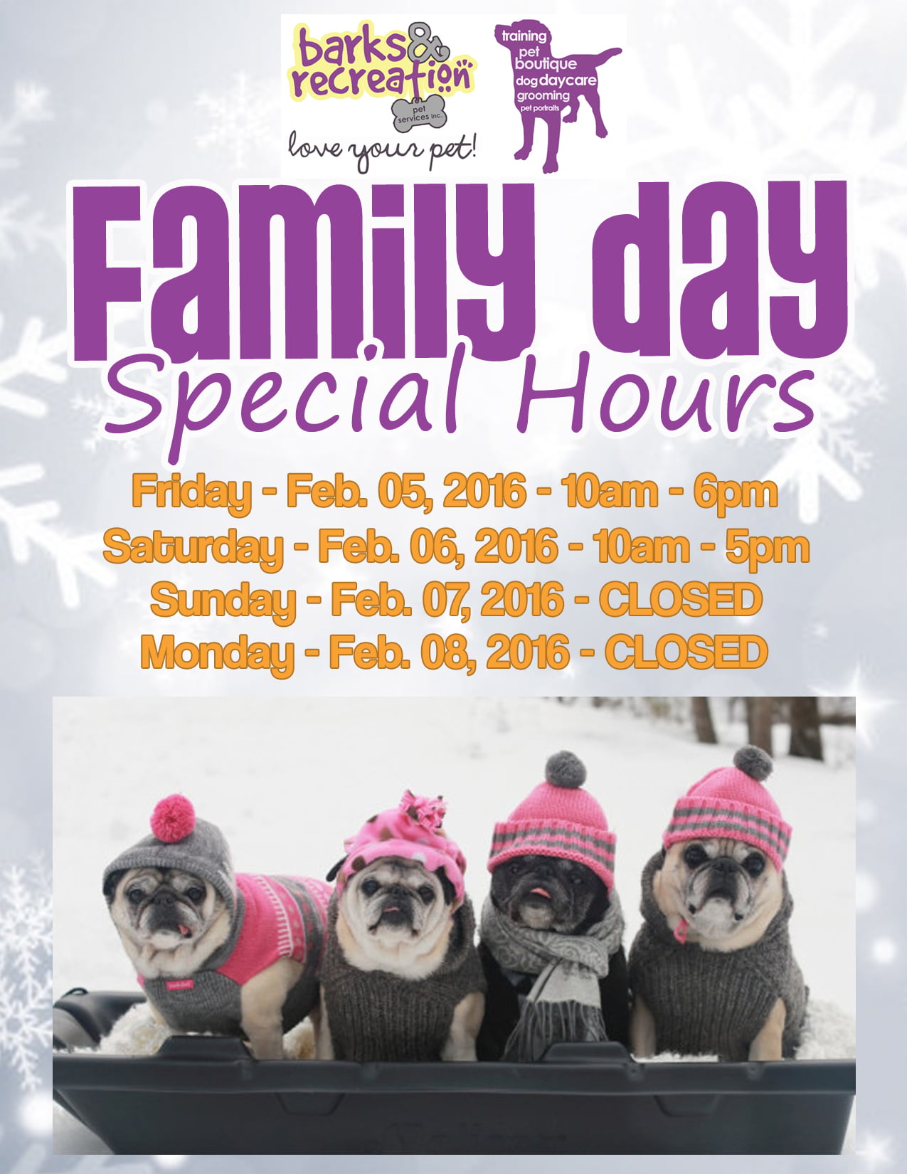 Barks and Recreation Family Day Weekend Store Hours